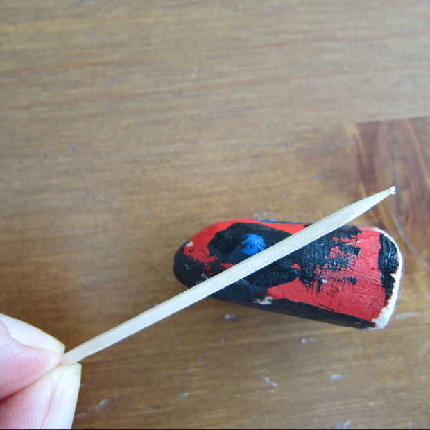 La cabeza es algo más complicada. (He tratado de mostrar la diagonal de la forma en que desea el orificio con un palillo de dientes. Disculpen la crudeza!) Desea También Perfore un agujero recto aproximadamente 1/2 pulgadas desde el extremo cortado totalmente a través de la madera. Entonces necesita una diagonal desde el orificio previamente perforado donde usted desee la boca.