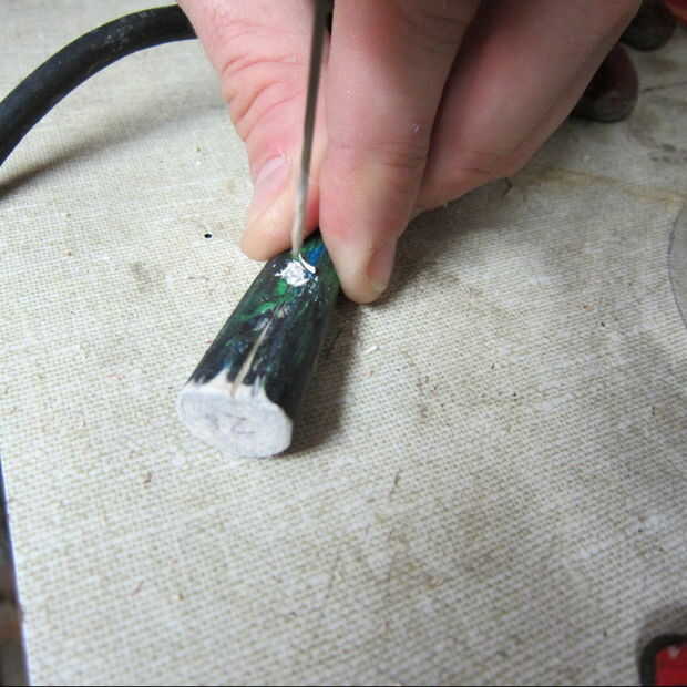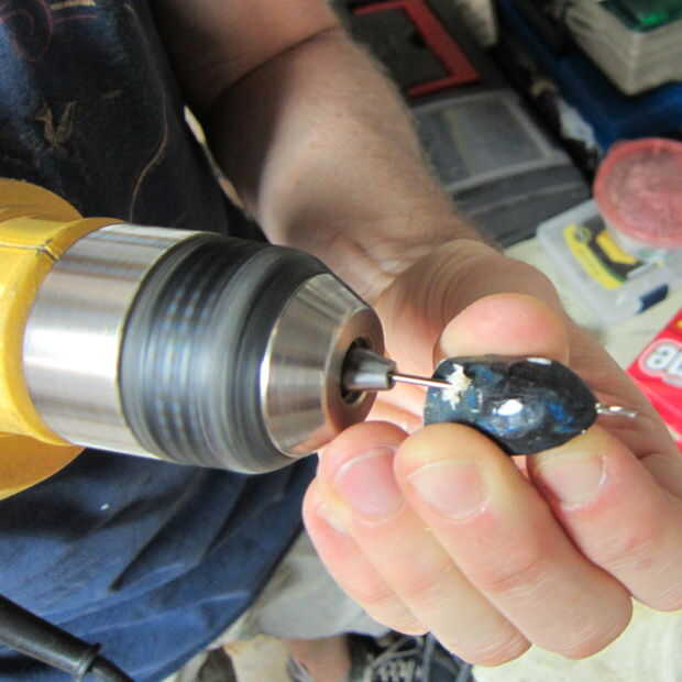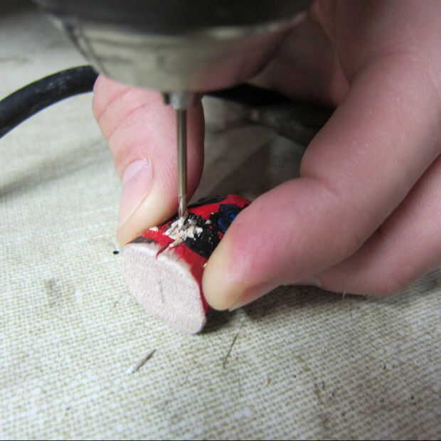 El agujero en la cola sólo tendrá que ser en desde el extremo cortado de 1/2 pulgada y perforar hacia abajo y completamente a través de la madera usando un 1/16 de pulgada broca.