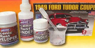 1. pintado modelo listo para óxido. Cuando terminó, el Ford 49 fue pintado en Borgoña y se dejó secar. Luego fue rociado con laca para el cabello y algunos pintura gris añadido. Esto se deja para secar durante varios minutos. La pintura entonces fue afligida con un corte a cepillo duro para crear el efecto de viejo, pintura desconchada. Esto era una buena base para el tratamiento de óxido escénico.