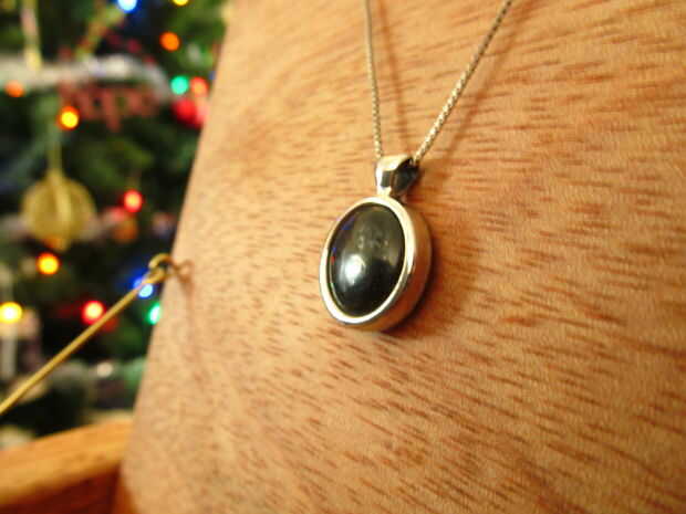 Para ir en su interior hice este colgante. El bisel está hecho de níquel, mientras que la piedra es de granito negro. El granito proviene de la obra de construcción de un casino de Las Vegas.