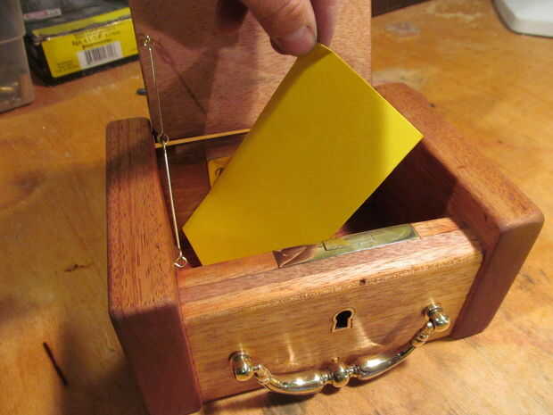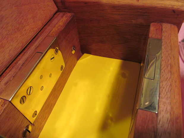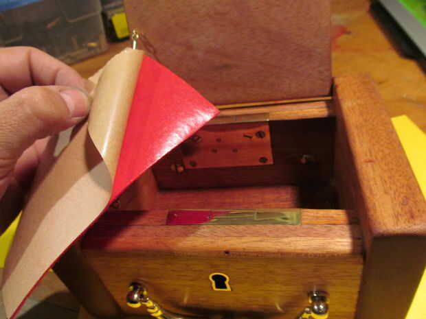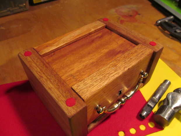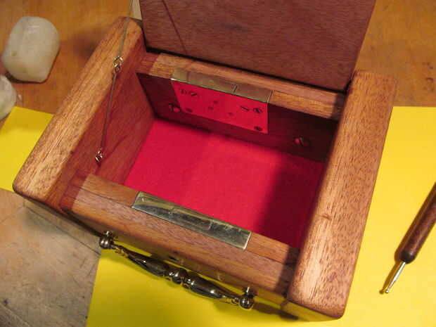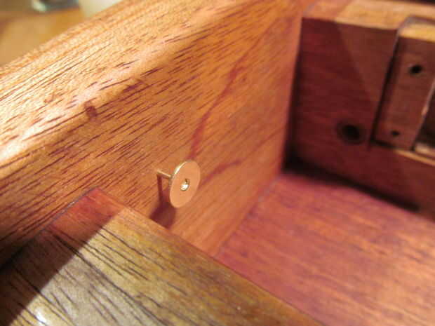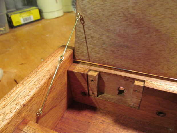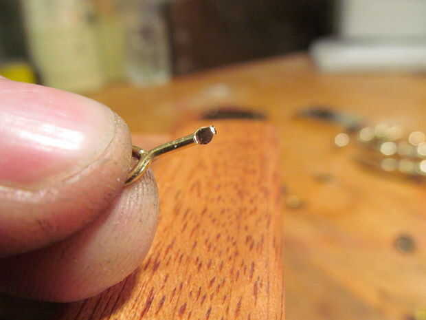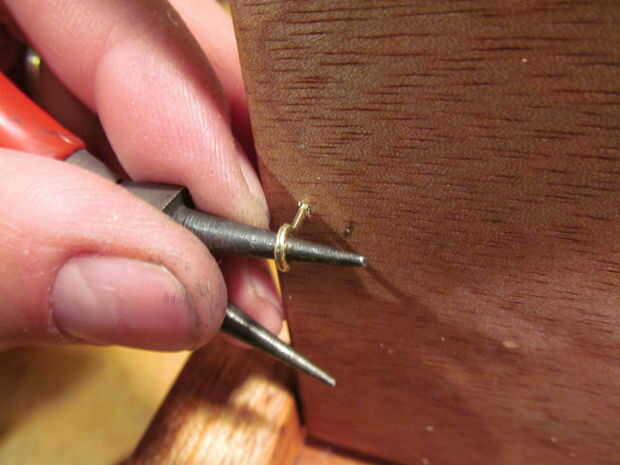 La captura fue hecha de varilla de latón. Con el fin de evitar el uso de tornillos que están "fuera de plazo" para el cuadro he instalado los puntos de anclaje por perforar la madera con una tachuela y luego quema el ojo ganchos para que ajuste la presión.