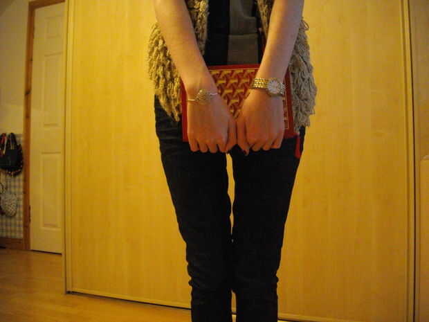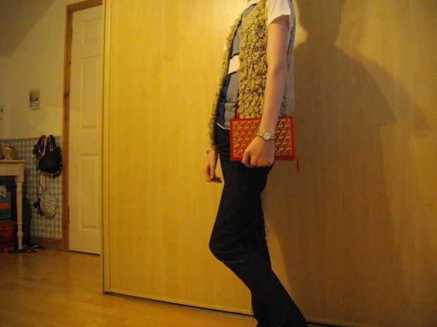 este es un monedero de fieltro embrague. Es tan fácil y divertido para hacer. Fue tejido con 2 hebras de peso peinada hilado a cabo juntos para simular una sola hebra de hilado abultado peso.
