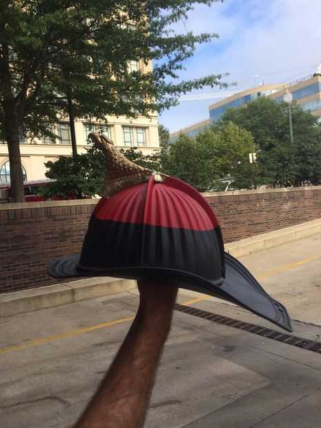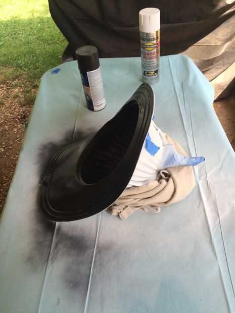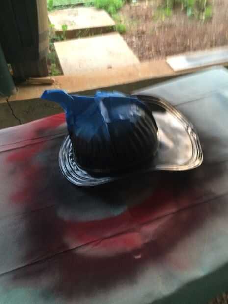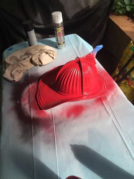 Decidí pintar mina de la misma manera como una empresa de Boston escalera, puesto que paseo en un camión de escalera. Para ello primero pinté la parte inferior y parte inferior del casco negro. Luego pinté la parte superior toda rojo. Una vez que la pintura estaba seca cuidadosamente utilicé cinta adhesiva para enmascarar el tercio superior del casco. Luego pinté el resto del casco negro. Cuando tomé la cinta fuera, conseguí el resultado que ves arriba. NO RETIRE LA CINTA DEL ÁGUILA TODAVÍA.