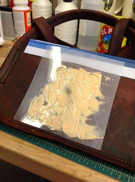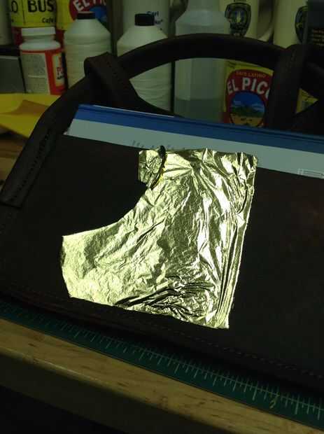 Aplique suavemente la hoja de oro para el área de pegado. Utilizar una obra de pincel seco la zona en un patrón circular empujando la hoja de oro de la forma del diseño.