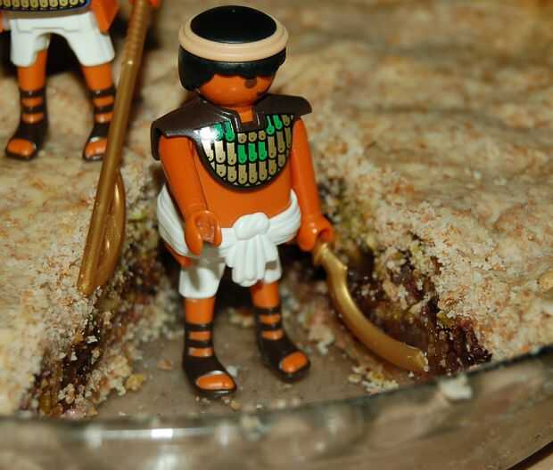 Como un homenaje a los "primeros pueblos de Pi(e)" he recreado la receta original del pastel de la tumba de Ramsés II. Los jeroglíficos detallan no sólo la receta, pero también homenaje al chef que creó el más temprano de empanadas. El chef era tan considerado que una estatua de su semejanza fue enterrada junto a Ramsés II para que el Faraón podría disfrutar de sus pies en la vida después (ver foto arriba).