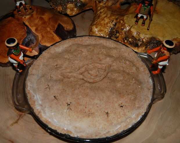 Repetir las capas para rellenar la tarta y cubierta con la segunda hoja de masa para sellar la empanada como un sarcófago de los faraones.