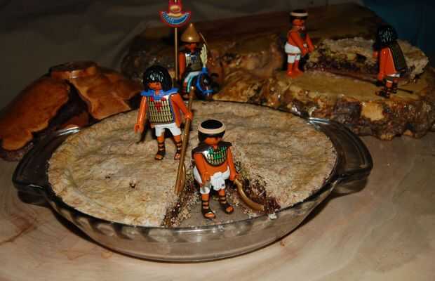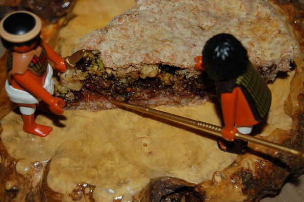 Todos los ingredientes de la tarta a partir de mitad del higos, entonces las fechas, las pasas de uva, mezclas de tuerca, miel de la capa y luego repita.