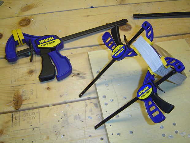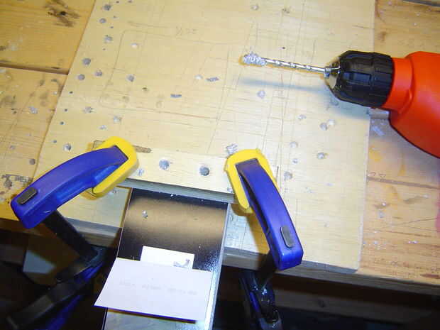Una serie de abrazaderas fue utilizada para sofocar toda la pila a un pedazo de madera de desecho. Tengo un pedazo pequeño de la plantilla de madera con agujeros pretaladrados que guía mi taladro. La imagen 2 muestra los agujeros perforados.