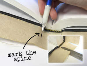 Coge tus tijeras y cortar estas marcas apenas tímido de donde comienza el libro. Doblar estas aletas hacia adentro. Esta parte del libro que no podemos pegar dentro de la columna vertebral, por lo que estamos plegándolas así que se ven como el resto de la cubierta.