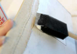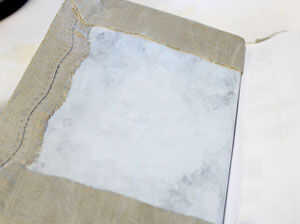 Puede usar un cepillo si usted acaba de conseguir una manicura, pero me gusta usar mis dedos para suavizar a la tela pegajosa a la cubierta. Usted obtendrá un ajuste más apretado, más suave. Alise la tela trabajar hacia afuera, hacia los bordes, tirando todo tan ajustado como sea posible. Al llegar al borde, dar el interior borde de una capa de una pulgada de pegamento y tire y suavizar el borde de la tela sobre él. Una vez que se alisa en su lugar, añadir más Mod Podge en la parte superior y alíselo con una brocha o los dedos para llegar realmente al ras con la cubierta.