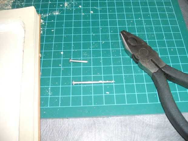 Poner las uñas en el agujero (mina tiene una bonita cabeza plana para la transferencia de presión) y marque donde salen. Utilice algunos cortadores para quitar cualquier exceso de longitud.