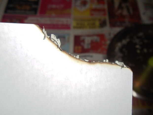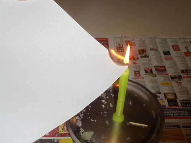 Mantener el borde del papel cerca de la llama de la vela y dejarlo quemar hasta conseguir la forma que desee, luego totalmente soplar el fuego en el papel con cuidado, como se muestra en la foto.