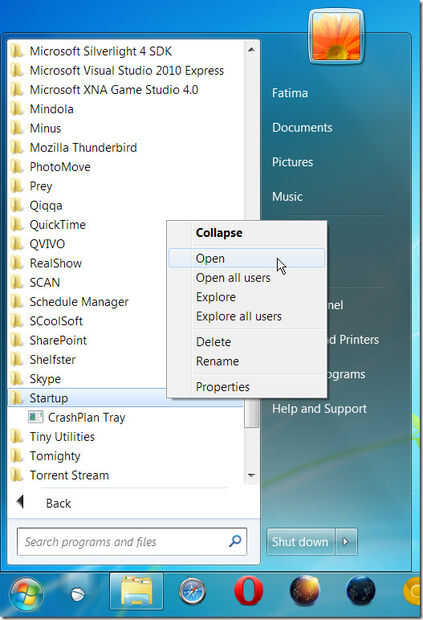 -Haga clic en el botón Inicio, haga clic en todos los programas, haga clic derecho en la carpeta Inicio y haga clic en abrir.