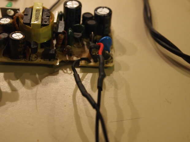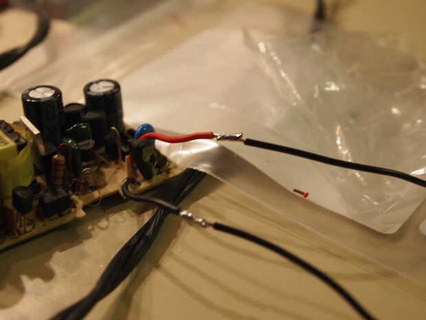 Porque el adaptador de corriente para el cubo estaba destinado a ser conectado a una pared, tuve que quitar aparte en los cables. Luego uno de los dos cables conectado a la red de entrada, el otro a un lado de la principal potencia del interruptor en la parte delantera. Luego, desde el interruptor hacia la red. Así el interruptor principal proporciona energía para el regulador, así como los focos de luz. Tomar nota de la tercera imagen, después de soldar con los dos cables de AC, utilicé abrigo del encogimiento para aislarlos. Es muy importante. Si no es evidente en este punto, la parte eléctrica de este proyecto es muy peligrosa si no sabes lo que estás haciendo! Uso del abrigo del encogimiento para cubrir cualquier cables eléctricos a la red es vital para su propia seguridad.