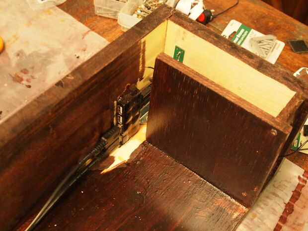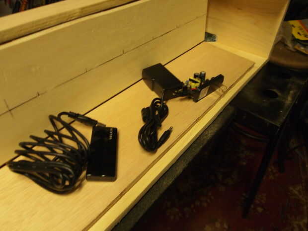 Una vez que se hicieron todos los conectores, montara la alimentación y el eje en el interior de la caja con pegamento caliente y epoxy. Reír todo lo que quieras! Pegamento caliente es impresionante! No no es bueno para el largo plazo, pero es grande para el corto plazo mantener las cosas en su lugar mientras el epoxi de larga duración es capaz de curar.
