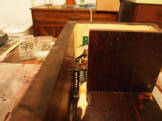Para el puerto de salida usb en el lado usé este conector vertical de sparkfun. Luego cortar el cable de usb del concentrador a un tramo corto agradable y había cableado hasta el tablero de arranque. (Estaba empezando a quedar sin espacio en estas esquinas, tanto cables usb tuvieron que ir).