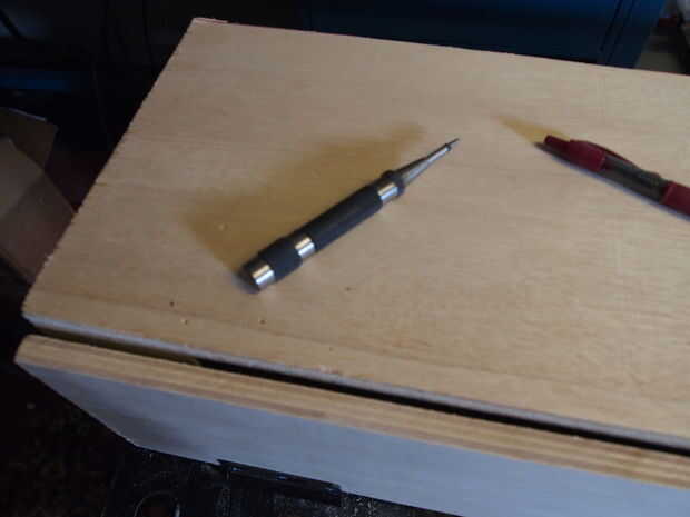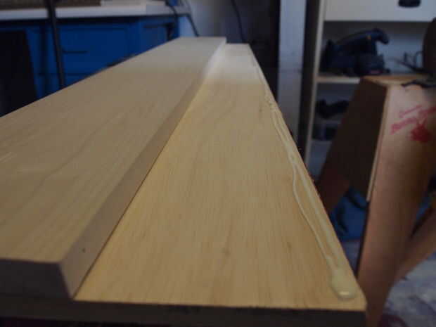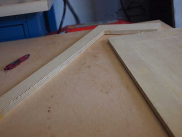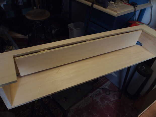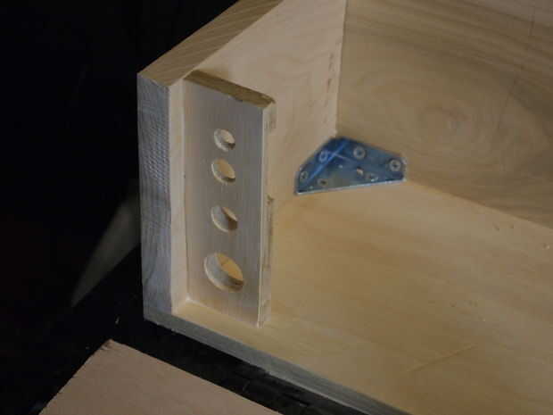 Cada pieza individualmente fue corte luego pegada con cola de madera y atornillado en el uso de taladros avellanados para mantener la junta al ras de los lados y la parte superior. Las piezas de esquina tenían soportes de ángulo caras 3 adicionales para proporcionar más apoyo. Pegaron y atornillaron todo junto con la excepción de la parte superior. Para la parte superior, yo sólo rosca, por lo que pude arena hacia abajo y haz los bordes liso pero siendo capaz de eliminar para la instalación de la electrónica y más tarde para la tinción de la madera.