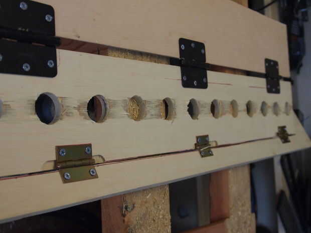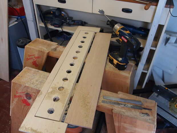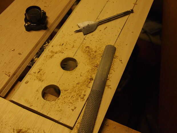 Una vez que las tablas fueron cortadas, perforé los agujeros en la placa principal con una pala de 1 1/4" bits. Algo para tomar nota de cuando se utiliza este tipo de brocas, son grandes en corte agradable alrededor de los agujeros de un tamaño exacto, también son excelentes en destrozando completamente su madera en la parte de atrás empiezas en. Ver las fotos de abajo. Afortunadamente sólo la parte superior es visible así que realmente no importa, aunque hizo un poco más difícil cuando monte los casquillos de bombilla más tarde.