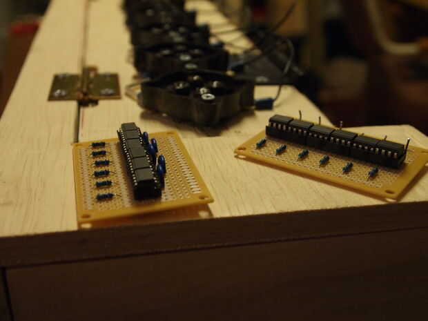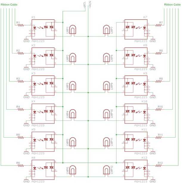 El circuito de lo que parecen todos los relés con los bulbos es la última imagen de arriba. Porque es tan sencillo, simplemente recogí una pequeña Junta de perf en radioshack . Las resistencias a ellos son necesarias ya que el microcontrolador está enviando 5V. Si nunca has iluminado por un led con un pin del microcontrolador, esto es exactamente lo mismo, literalmente. En el relé de estado sólido es que un pequeño emisor infrarrojos led que se encuentra al lado de un mosfet de foto sensible. Cuando enciende el led, el mosfet se cierra. Si revisas la hoja de datos, necesita 1.2V a través del led con 10 mA de corriente. Entonces, de 5V obtiene: 5V - 1.2V = 3.8V... 3.8V/(10mA) = 380 ohms. Realmente nada en este rango de trabajo + - unos 100 ohmios.