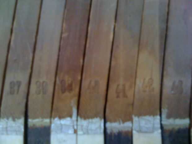 Seguir adelante y ordenar las teclas en un orden que funciona. Las llaves que tenía estaban contadas, pero a veces que no ayuda. Las llaves fueron estampadas alrededor 1913 (creo), hasta la 38 y 83 parecía muy similar, por ejemplo. También terminamos con tres #19s fuera el mismo piano. Vaya figura. En cualquier caso organizarlos encajan de una manera que se ve bien a usted como un estante.