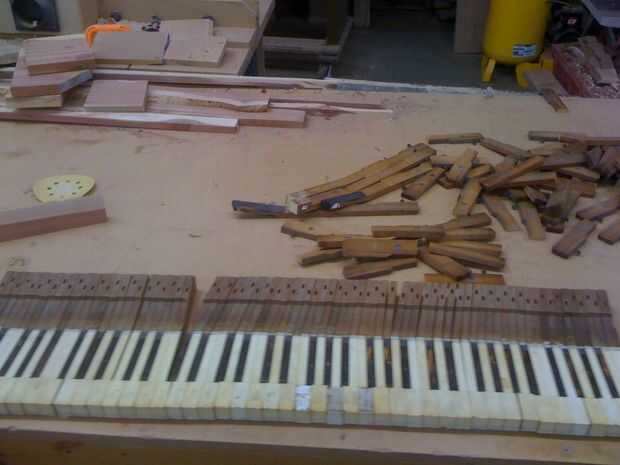 utilizamos una caja de corte con una sierra de mesa para hacer esto. Fija un bloque en una distancia dada del centro, haciendo una plantilla. Uno de nosotros corta las teclas mientras el otro tomó la llave de corte y entregó el cortador de la siguiente tecla a recortarse. funcionó bastante bien, y hemos podido obtener a través de las teclas en unos 15 minutos. Si eres mano sierras, permiten un día completo, a menos que sea Hercules.