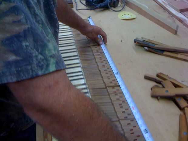 Medir el ancho de las teclas y su altura. Usted tendrá que dibujar un rectángulo de esa longitud y la altura en uno de los postes de la parte de piano. Esto se convertirá en una ranura que tiene las llaves que forman el estante.