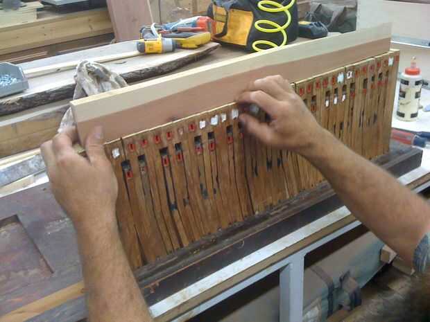 Los diferentes ángulos de las teclas requerirá a unos separadores para que las teclas no te sueltas. Utilizamos cuñas triangulares martillados de la parte posterior al espacio no sólo los ángulos, pero para proporcionar la tensión para mantener las claves.