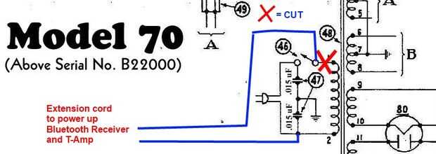Otra vez, por respeto a la radio y la idea de que algún día alguien puede restaurar totalmente, he intentado reducir al mínimo el cableado relacionados con el uso de su botón de encendido. Básicamente, se me quitan una pata del transformador de alimentación principal de uso por cortar ese alambre y cinta adhesiva del lado del transformador de la misma. Entonces había conectado un cable de extensión en el circuito como se muestra. Esto permite que el AC encendido/apagado interrumpir la energía a la extensión y elimina totalmente el circuito de la CA de la radio, con la excepción de los condensadores de filtro pequeño que se muestra en el esquema.