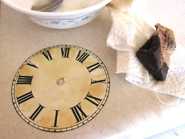 Encontré un reemplazo de la cara de reloj y era demasiado grande para la aplicación, así que hice una copia y redujo el tamaño usando una fotocopiadora y imprimirla en papel fotográfico. Sin embargo, el papel de la foto era a brillante así que tuve que antiguos mediante el uso de una bolsa de té usada. Coloque el bolso de té usado en la nueva cara de reloj y presione hacia abajo en varios lugares y dejar secar. Puedes hacer esto varias veces hasta obtener el aspecto y el color que desee.