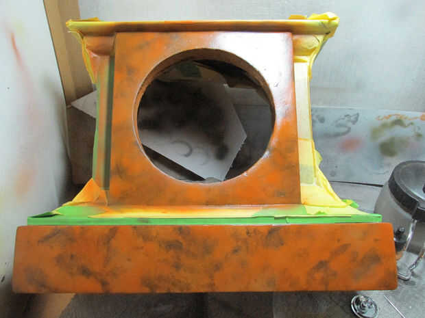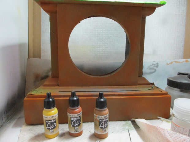 Sacó el aerógrafo para pintar un color de base para el burl. En lugar de pintar una capa plana de color, pensé que sería mejor tener una modulación del color. Utilicé colores de Model Air (acrílico) y pintado en un patrón de ocho locos de movimiento, creando zonas claras y oscuras. También cambió los colores de pintura también – amarillo tostado y rojo marrón.
