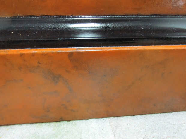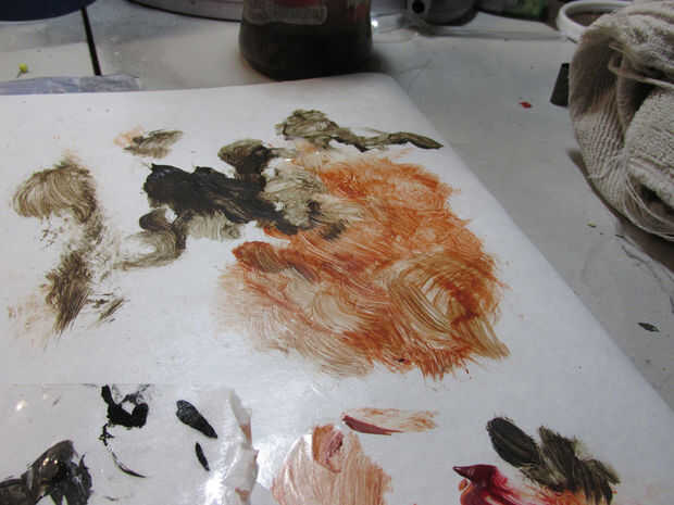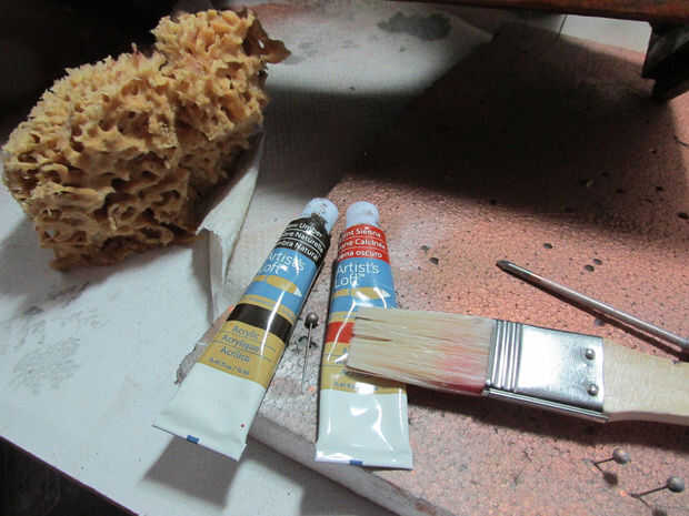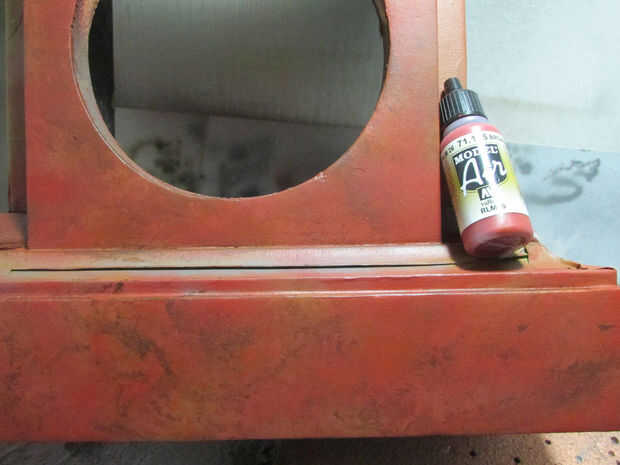 Una vez seco, reemplacé el aerógrafo con un pincel. Tres colores de acrílico del artista fueron sombra usada, rojo, quemado y Siena quemado. Usé también... acrílico satinado.