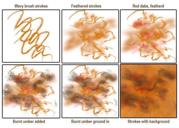 Usé la tierra de Siena quemada como base y pintado, no en trazos rectos o pesados, pero en un patrón ondulado ligero. Luego utilicé un pincel limpio más grande a la pluma el patrón mediante trazos al azar. Había añadido el rojo en ahorradores de lenguados y luego sacarlos también de plumas. Tenga cuidado, usted no quiere demasiado rojo.
