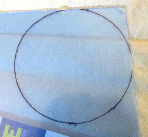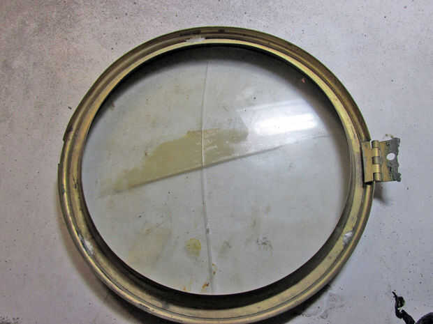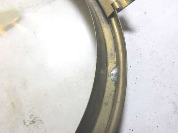 El vidrio se llevó a cabo en por un anillo de cobre amarillo que fue soldado en el bisel con plomo en tres puntos. Tuve que raspar hacia fuera el cable para liberar el anillo y el vidrio.