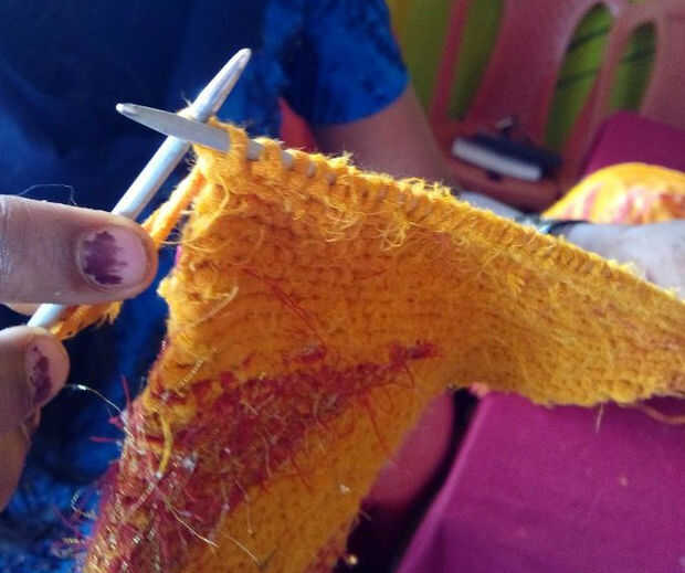 • Después de cambiar el hilo reanudar 2 nudos de la última línea del 1er trimestre (como se muestra en la imagen) a la aguja derecha. Intercambio de la aguja que significa aguja mano derecha mano izquierda mano izquierda la aguja a mano derecha ahora revers el hilo que debe ser entre las dos agujas de cuando hemos hecho en el inicio como eso solamente.