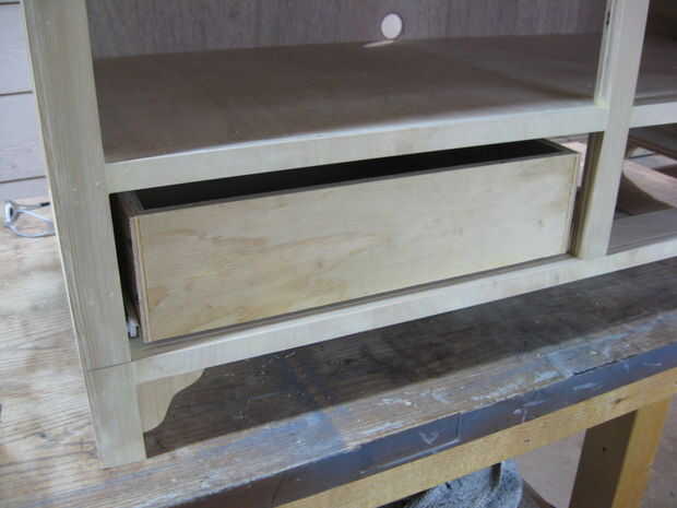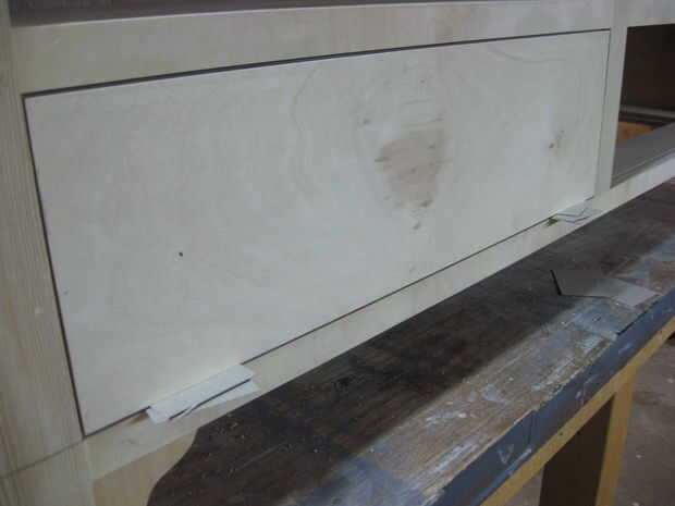 Con las cajas del cajón en el gabinete y todos los ajustes realizados, las caras se llevaron a cabo en el lugar donde veía bien, y entonces temporalmente con un par de clavos. Cada cajón entonces fue quitado y los tornillos fueron agregados para garantizar las caras permanentemente.