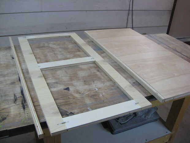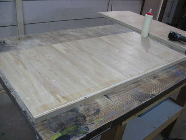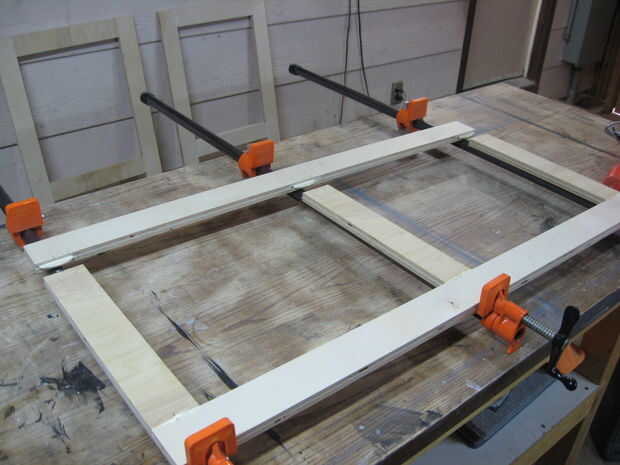 Los marcos de la plataforma fueron construidos utilizando galletas, pegamento y pinzas. Los dos estantes superiores estaban cubiertos con una piel de madera del cuarto de pulgada de mi montón de chatarra. El estante inferior no era, ya que es principalmente estructural y se oculta por los cajones.