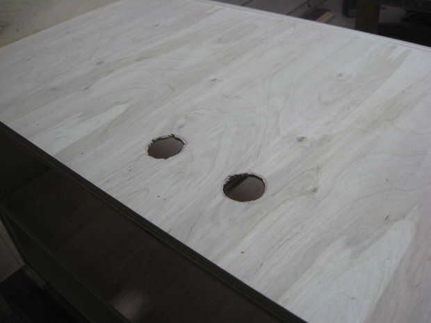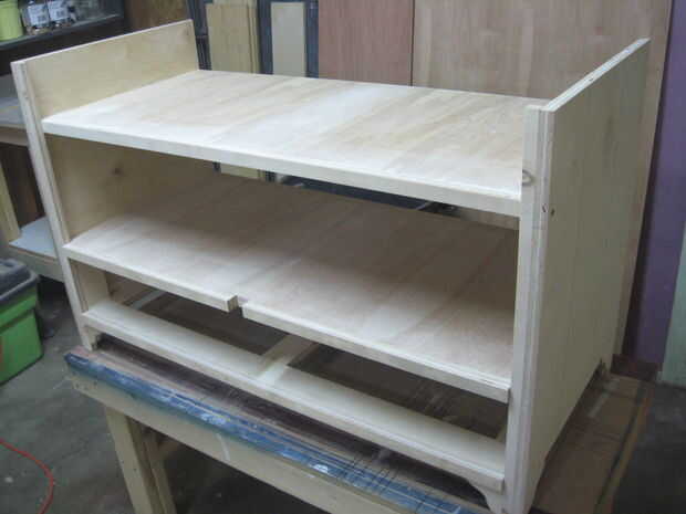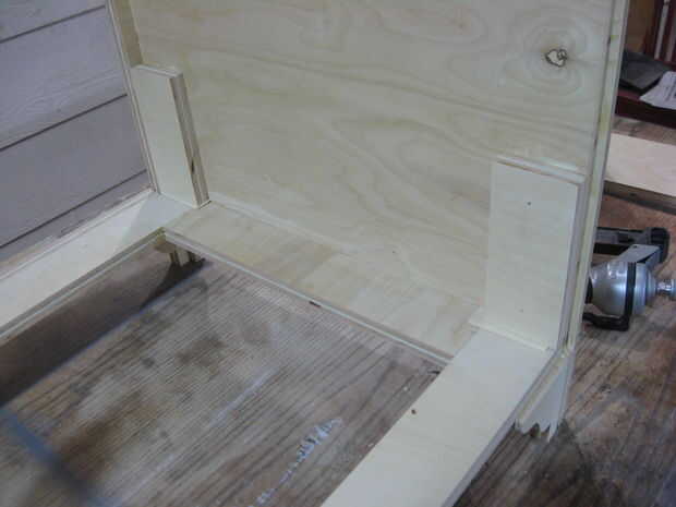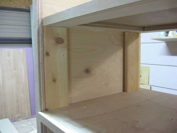 El estante inferior en realidad tiene estos soportes pegados y clavados en su lugar, que se utilizan para fijar el cajón guiadoras para más adelante.