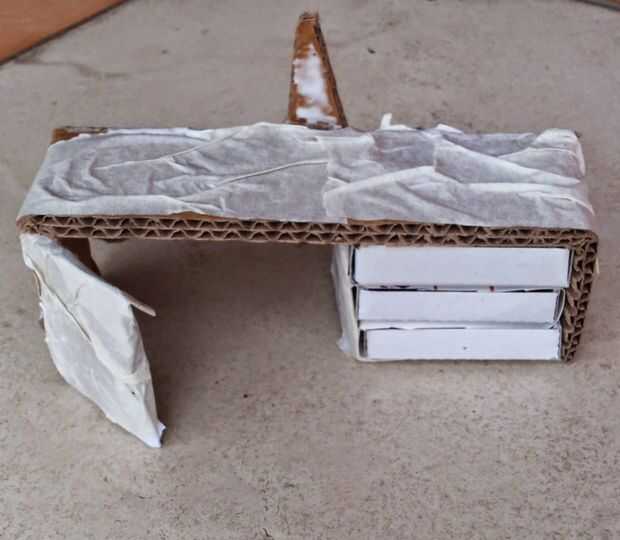 Las aletas laterales que equivalen a la altura de la mesa. Además, utilizar la natural parte acanalada de la cartulina para formar los bordes de la tabla. Para los cajones apilar las 3 cajas de fósforo encima de la otra.