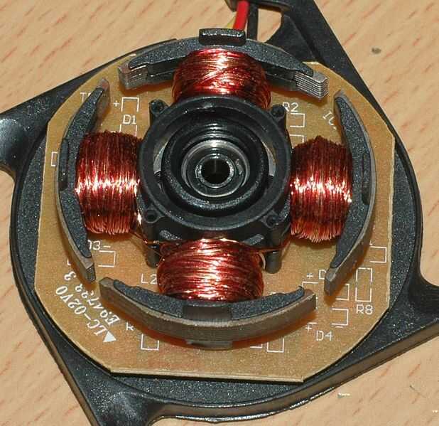 El motor BLDC usado aquí tiene un bobinado de estator y un Rotor de imán permanente. El motor se suministra 12V DC. Pero la rotación del campo magnético es generada por la electrónica (conmutador electrónico). Como su nombre indica, los componentes de la electrónica convierten DC en AC que hace presentó el magnético en el estator gire.