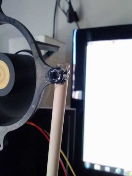 Acople 2 palos, o más si es necesario, en los lados del ventilador usando una pistola de pegamento. Estos palillos le ayudará a hacer que el ventilador pare.