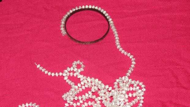 Preparar el pegamento caliente. Aplicar pegamento en el brazalete y pegar las cuentas de la cadena alrededor de la pulsera. Corte el exceso.