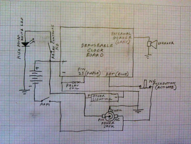 Todos los circuitos de iluminación son independientes unos de otros, por lo que simplemente se conectan al bus de energía. Según el esquema, cuando en la batería, el interruptor de brazo debe ser encendido para el circuito de alimentación, y ya que este molido el pin "det" en el reloj, que funciona sólo en modo de cuenta regresiva. Cuando se conecta energía externa, se rompe la conexión normalmente cerrada en la toma de corriente y el luego funciona como un reloj. Todavía puede activarse pulsando el botón rojo.