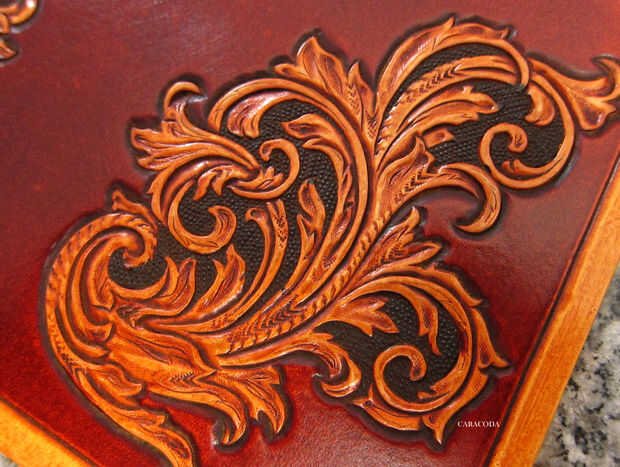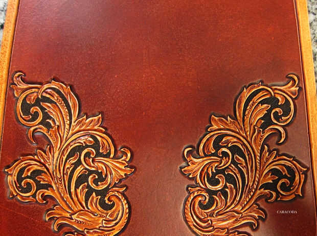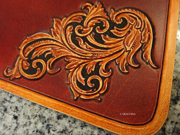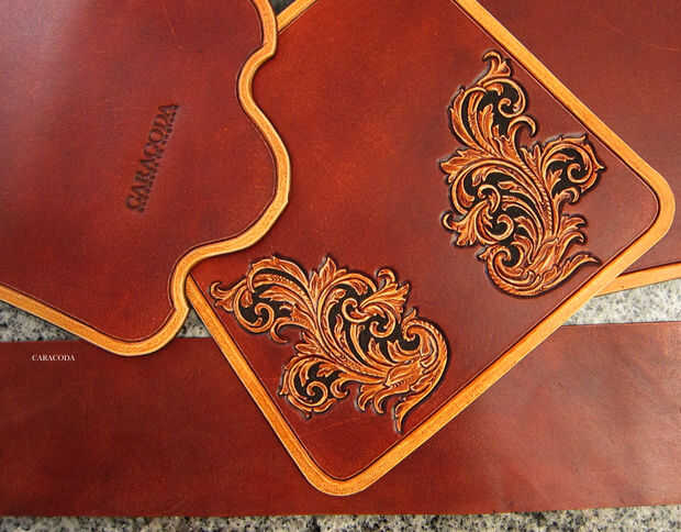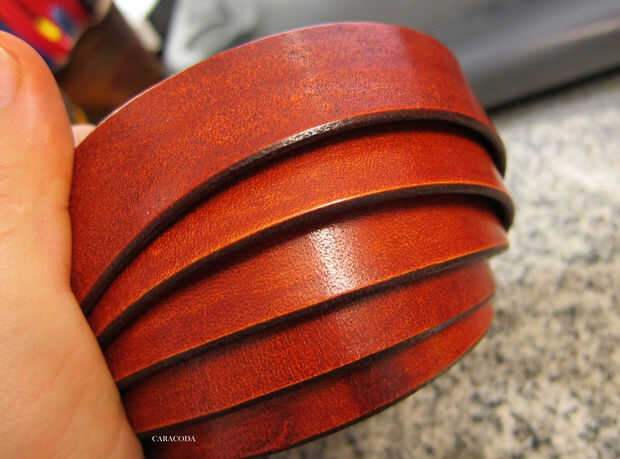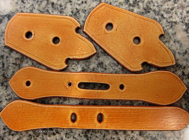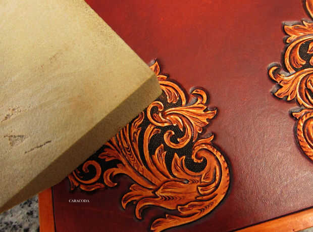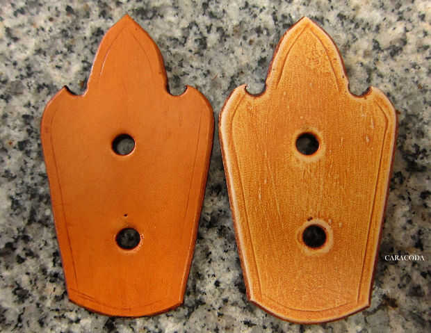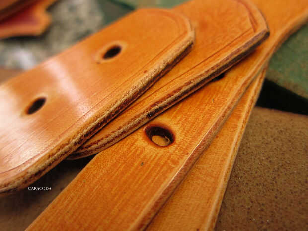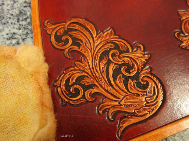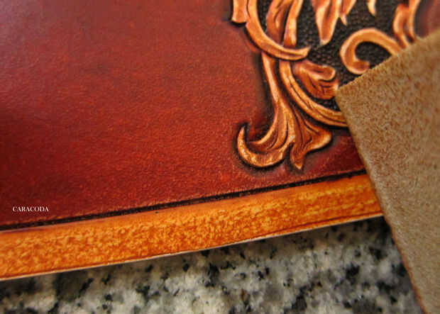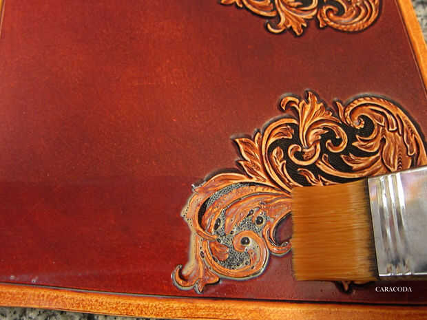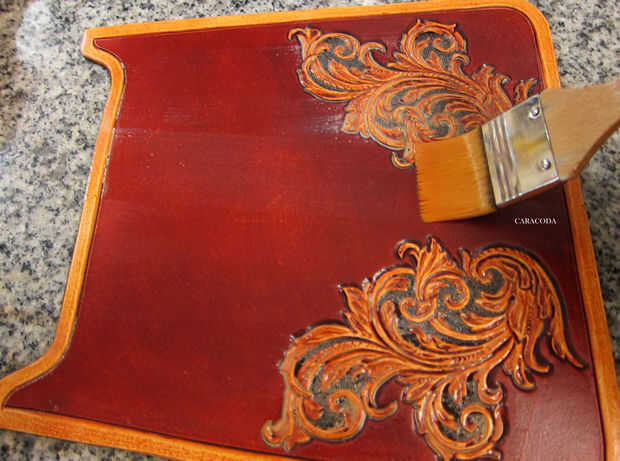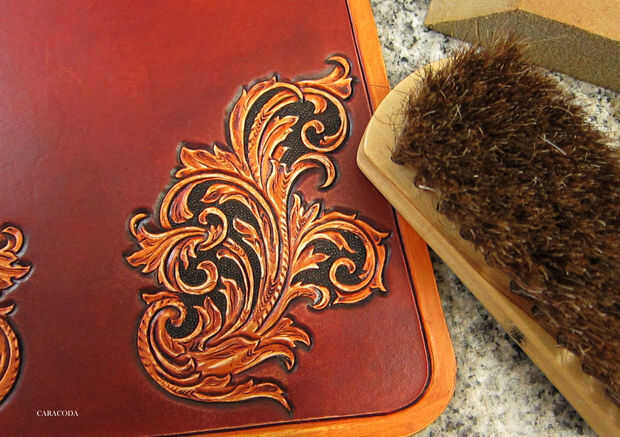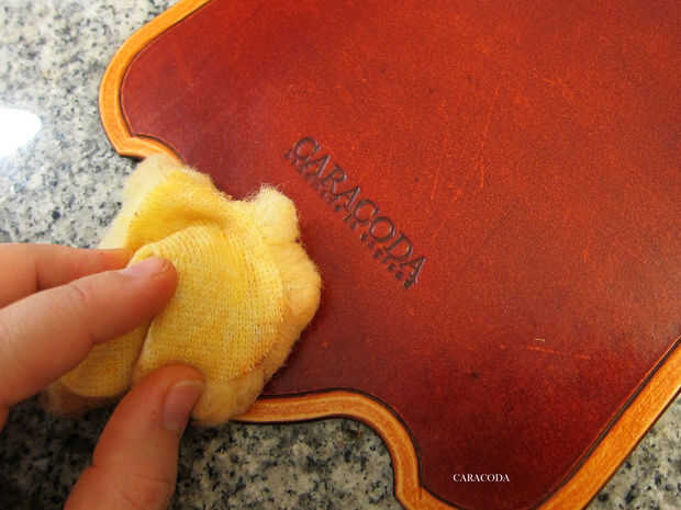 Utilizar cualquier acabado de cuero (yo usé Eco-Flo Super Shene) y aplicarlo a todas las partes en la parte delantera y espalda. Generalmente aplico dos capas con un tiempo de secado entre ellas.