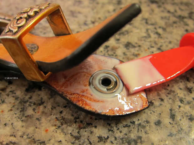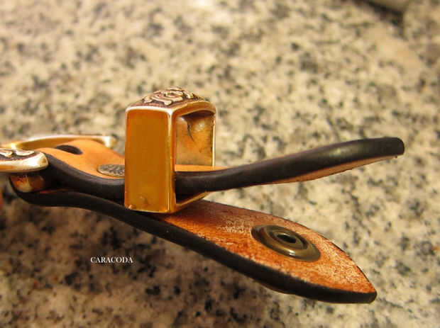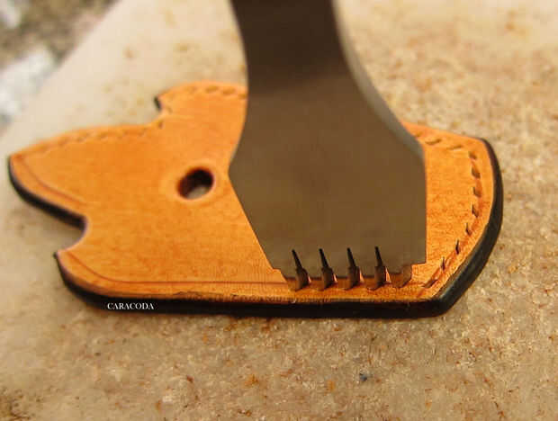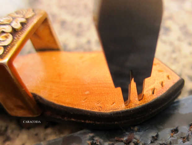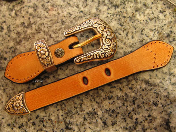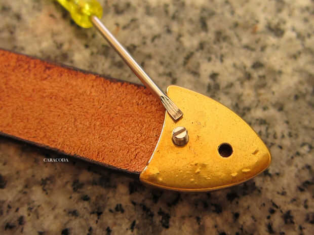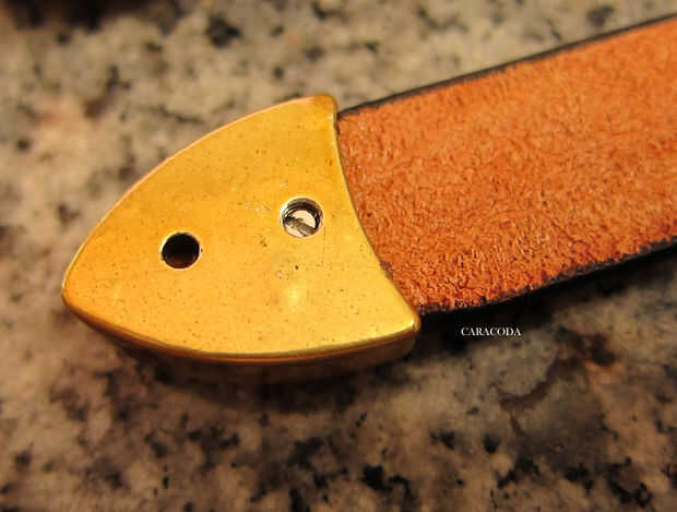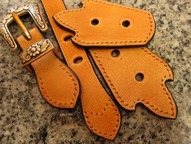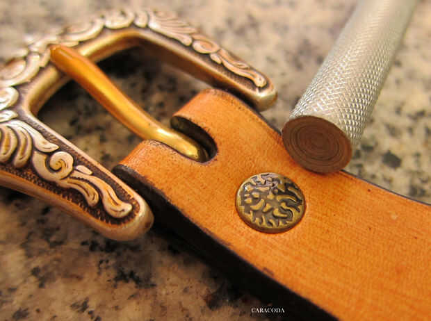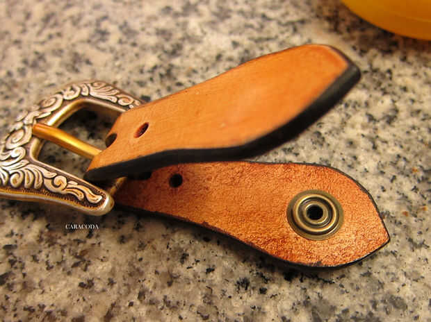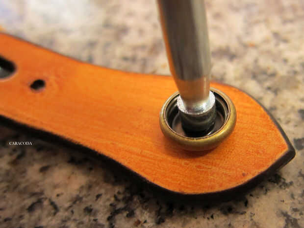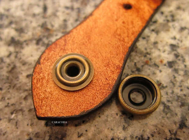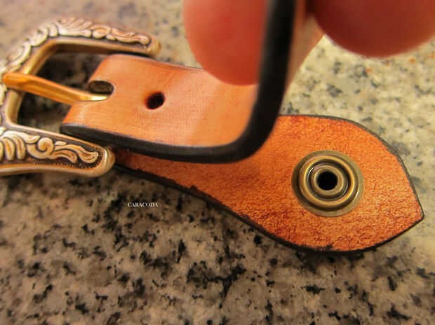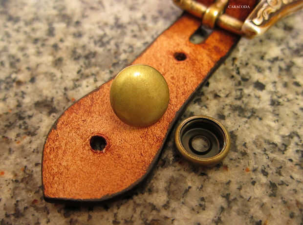 Las imágenes hablan por sí mismos básicamente, hay no hay mucho para agregar... Utiliza dos "partes inferiores de la presión que ven en la imagen, luego instalarlo. Instalar un remache para sujetar la hebilla y el soporte de la correa (podría ser llamarlo nombre incorrecto). Luego pegar el cuero juntos ocultando el cierre interior. Marque los orificios de costuras con un hierro punzante. Marcarlos en todas las piezas pequeñas. Instalar la esquina de punta utilizando cemento de contacto y un tornillo sin cabeza (espero que este es el nombre correcto para él)