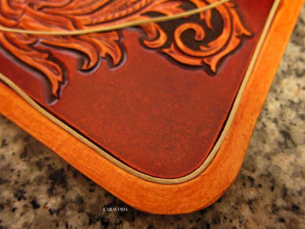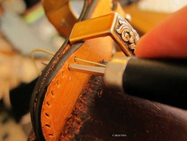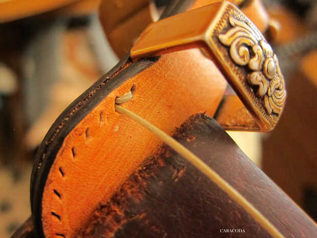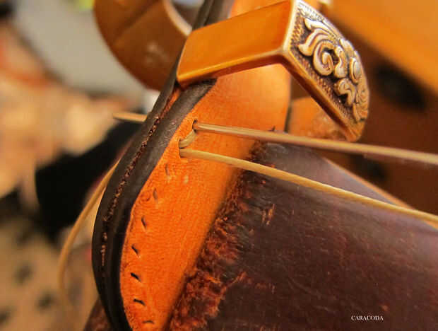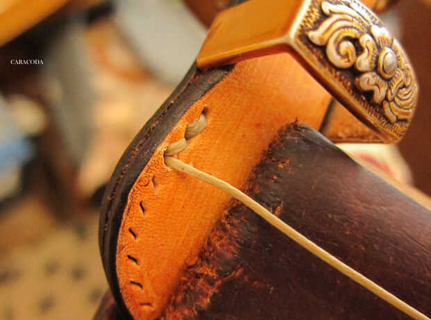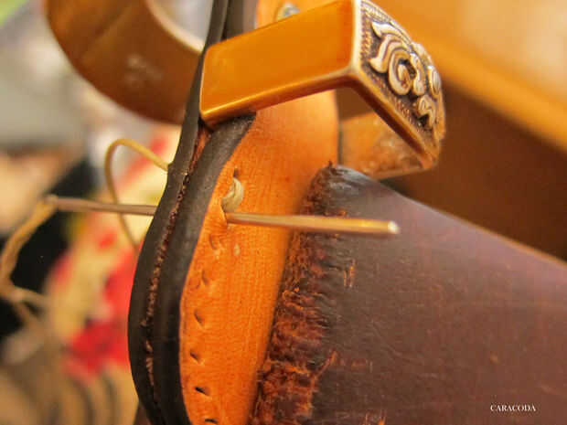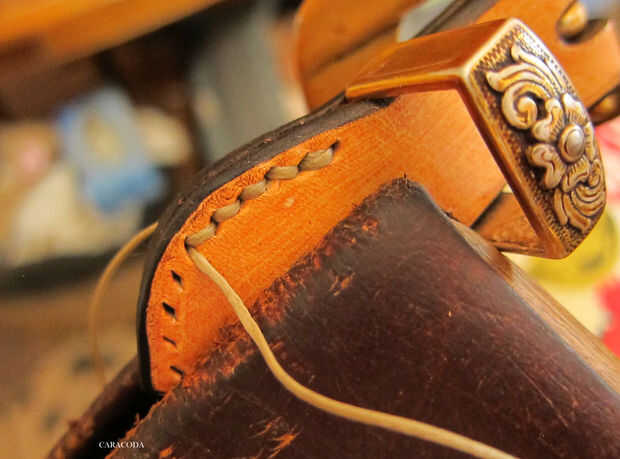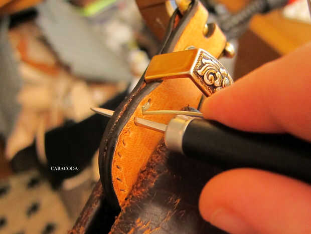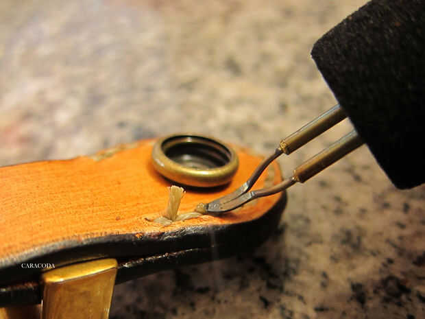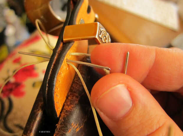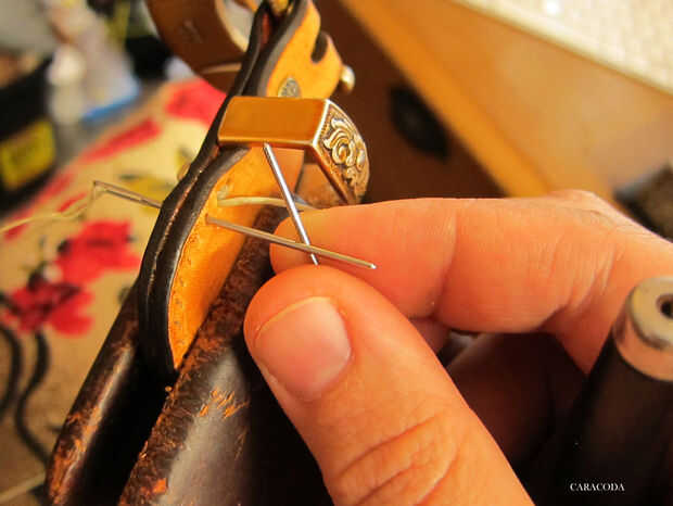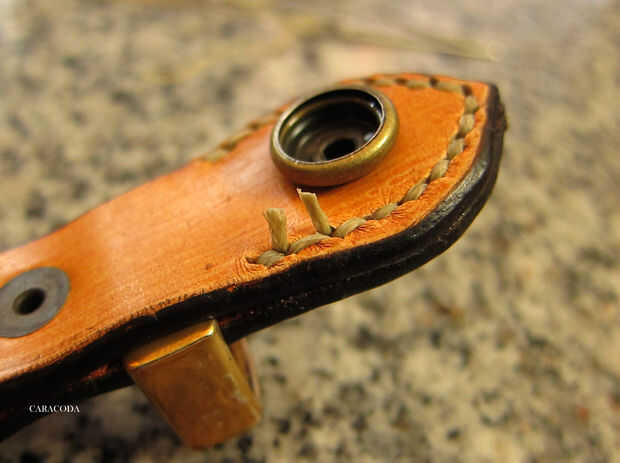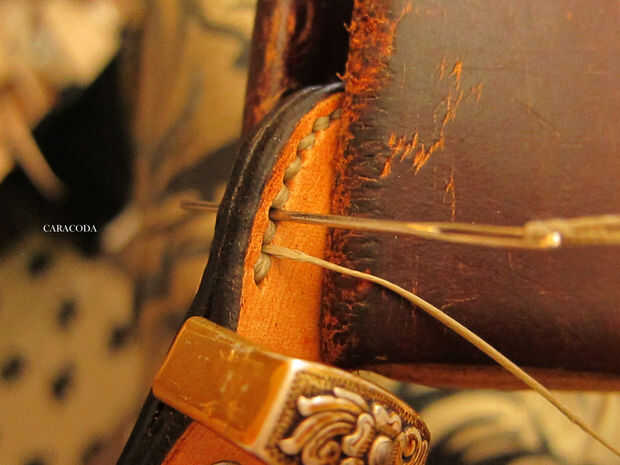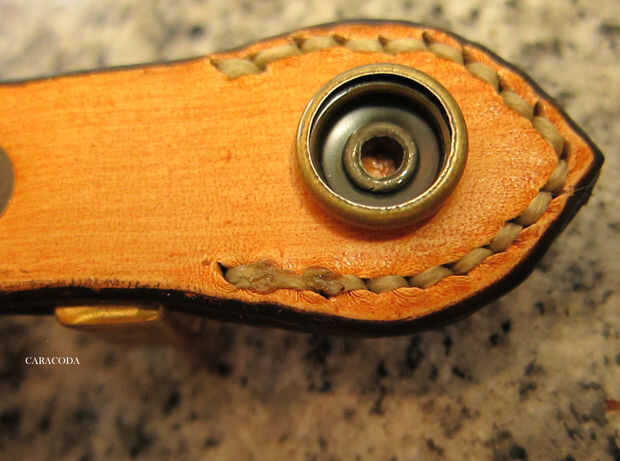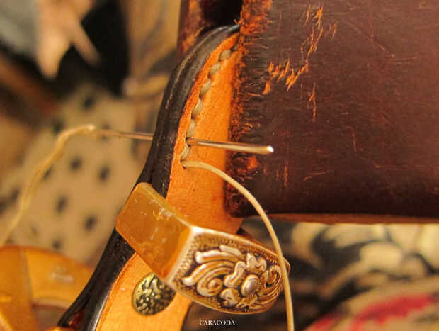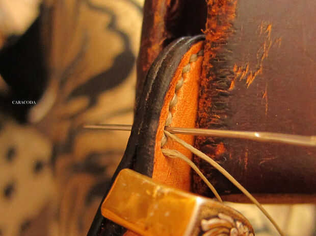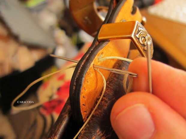 Al llegar al último agujero hacer unas puntadas en la dirección opuesta (puntada hacia atrás) a través de los mismos orificios. Tire los hilos de rosca en el lado "equivocado", cortar corto y una estación más ligero o leña (como es mi caso) para derretir los extremos de hilo (y para arreglarlos)