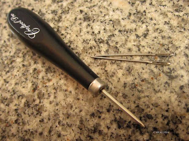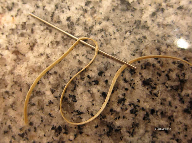 Empezar por la perforación del primer agujero con un punzón. Tire una aguja a través del agujero y en otro lado. Tire del hilo a través de hacer ambos extremos de la misma longitud.