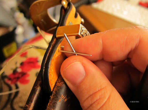 Hacer otro agujero con un punzón. Meter la aguja de "izquierda" a través del orificio en el lado derecho y empuje la aguja «derecha» a través del mismo agujero en el lado izquierdo. Tire del hilo a ambos lados firmemente hacer una puntada. Llevar a cabo en el mismo orden: perforar un agujero con un punzón, aguja izquierda Empuje hacia la derecha a través de este agujero, a continuación, empuje la aguja derecha a la izquierda a través del mismo agujero, tirar hilo haciendo una puntada apretada. Tratar de perforar los agujeros con el punzón en el mismo ángulo todo el tiempo para hacer puntadas agradable e incluso.