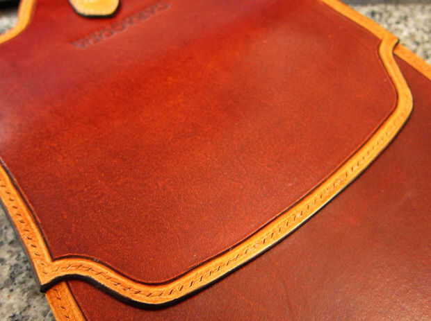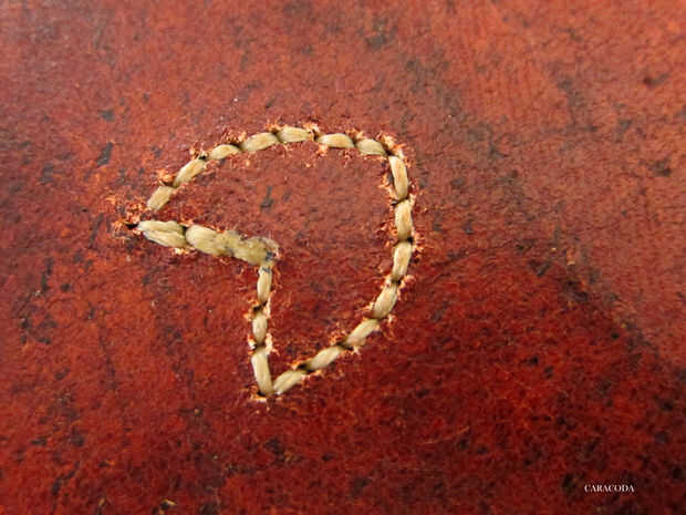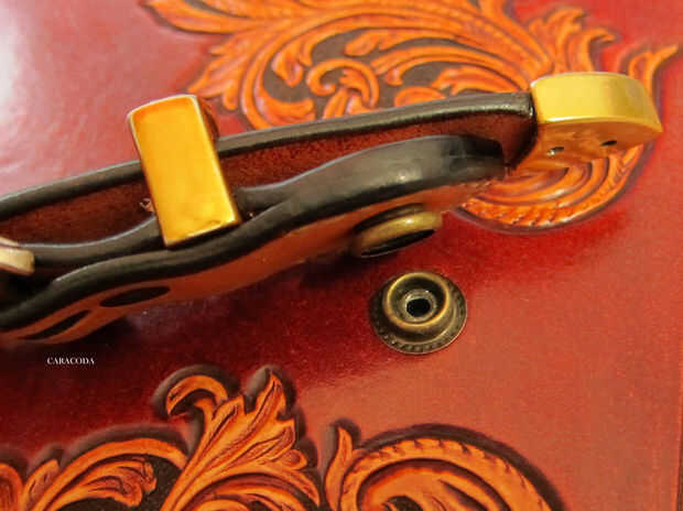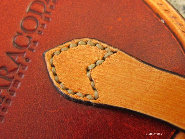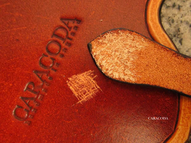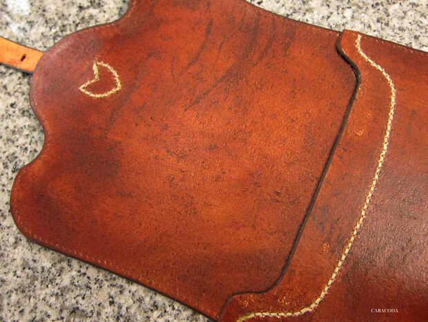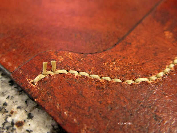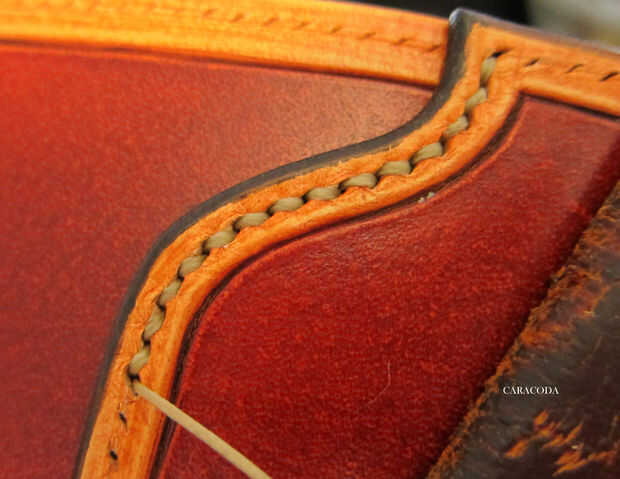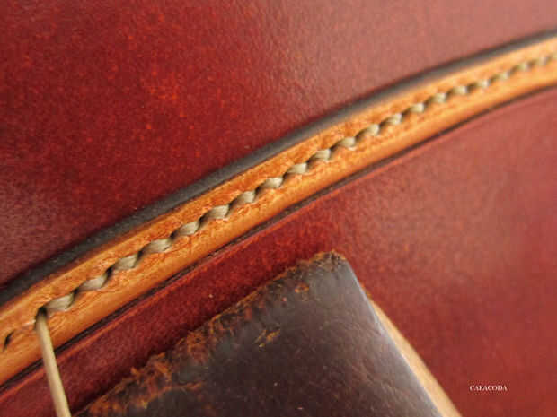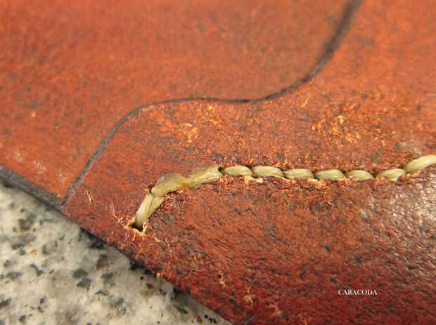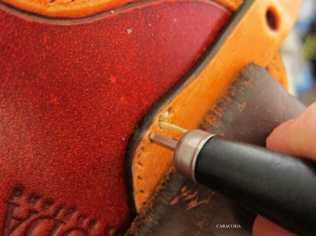 Tome una brújula rasguño y marque una línea de costura 4mm del borde en ambos paneles y en la solapa. Marque los orificios costuras a lo largo de esta línea, pinchazo de hierro o con una rueda de costura. Ubicar la colocación de la correa de cierre (véase el modelo) y lijar o rayar la pintura allí para mejor contacto pegamento. Aplicar alguna soldadura de leathercraft ot de cemento de contacto y la correa de la aleta del pegamento cuando está seca y pegajosa. Coser (uso un pony de costura).