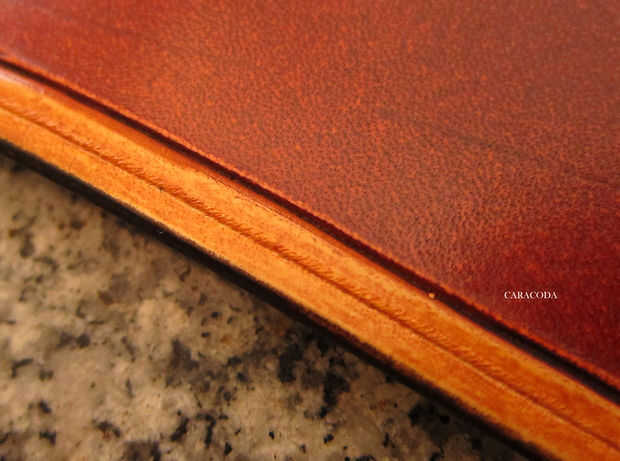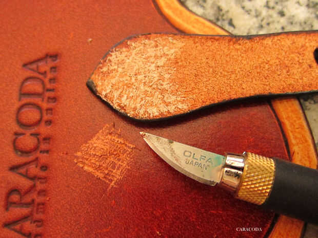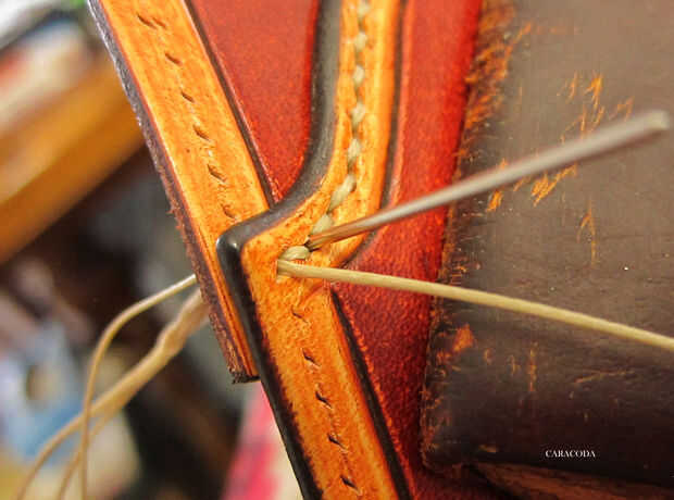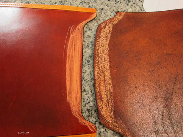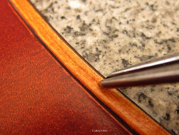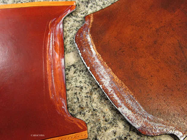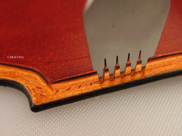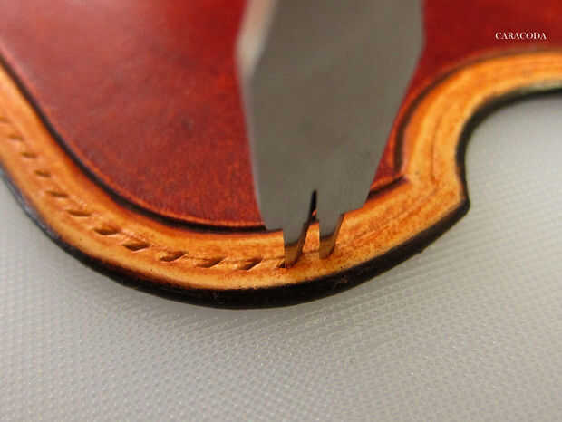 No skive los bordes de la parte trasera, los que van a ser cosidos juntos. Aplicar pegamento, espere hasta que hortera y conectar dos piezas. Ahora bien los punto. Martillo de la línea de costura para colocar el hilo de cuero.