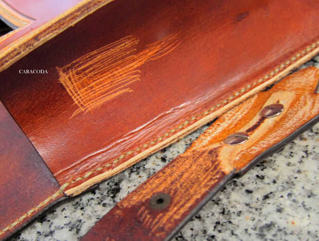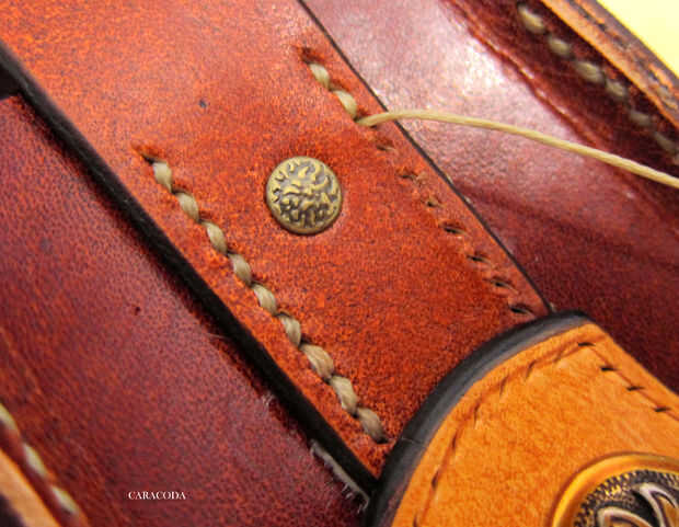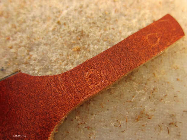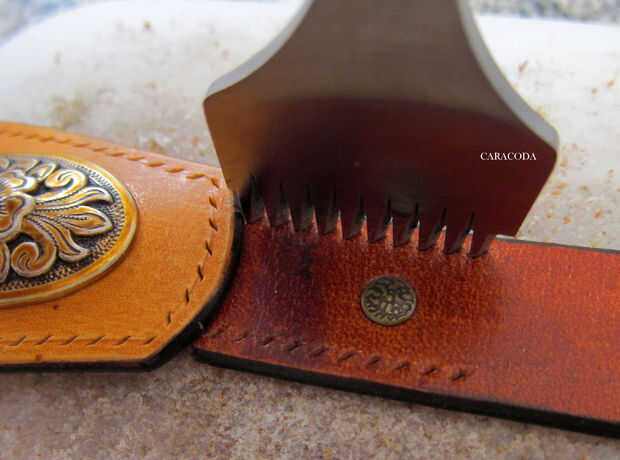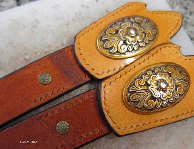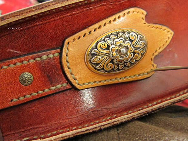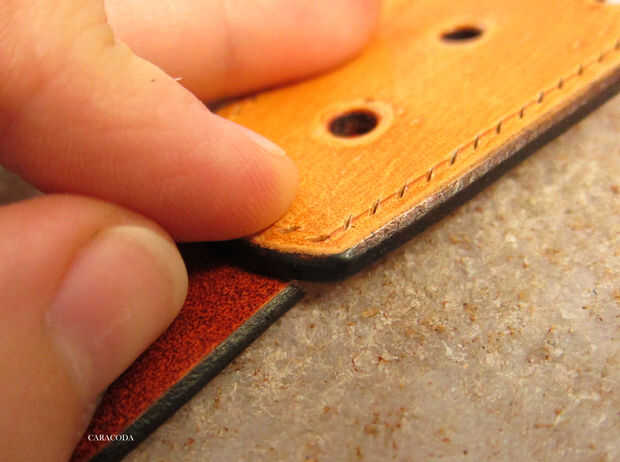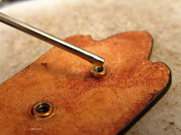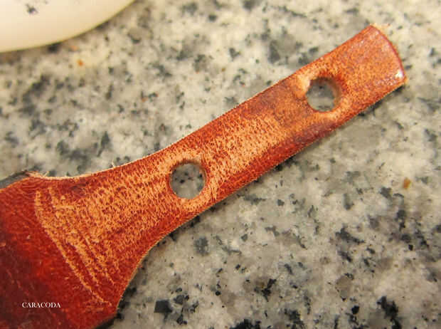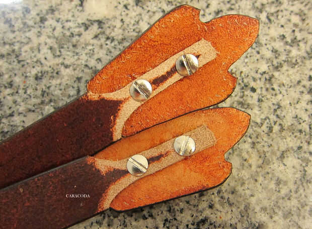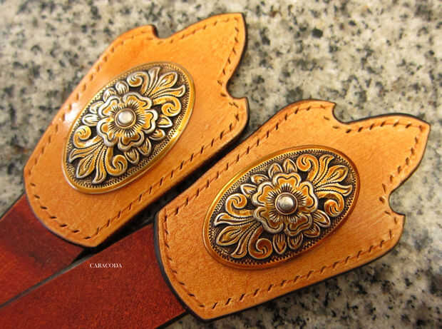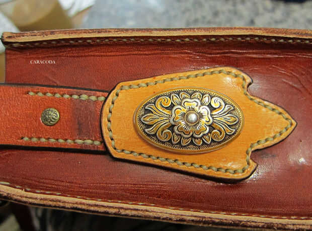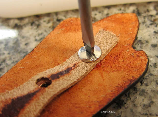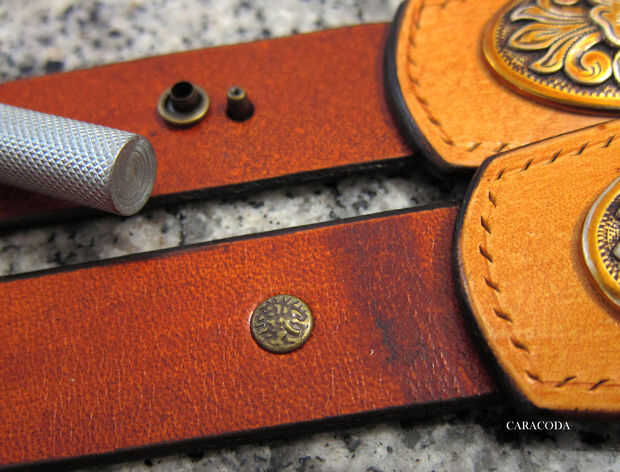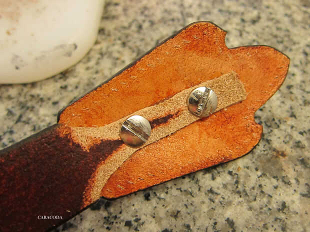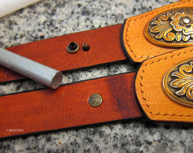 Ubique los orificios de concho y marcarlos. Corte los extremos de la correa para que quepa debajo de las colocaciones de concho. Perforar los agujeros. Fije el conchos: poner cemento dentro de contacto y luego coloque la correa con tornillos (firmemente).